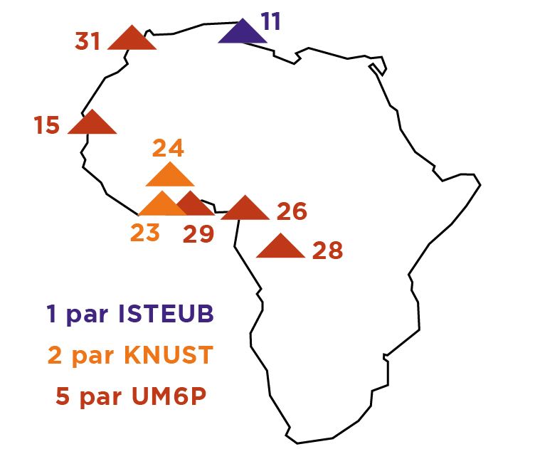 Huit sessions ont au total été organisées. En Tunisie, par l’ISTEUB - Université de Carthage (une session) sur le thème de l’Habitat résilient ; au Ghana par le centre TRECK – KNUST (deux sessions) sur la mobilité urbaine durable ; en RDC, Cameroun, Maroc, Togo, et en Mauritanie par l’UM6P sur le thème de la gestion des données urbaines. Ces sessions ont permis de renforcer les compétences d’environ 200 participants sur ces thématiques, compétences aujourd’hui mises en pratique dans leur activité professionnelle.